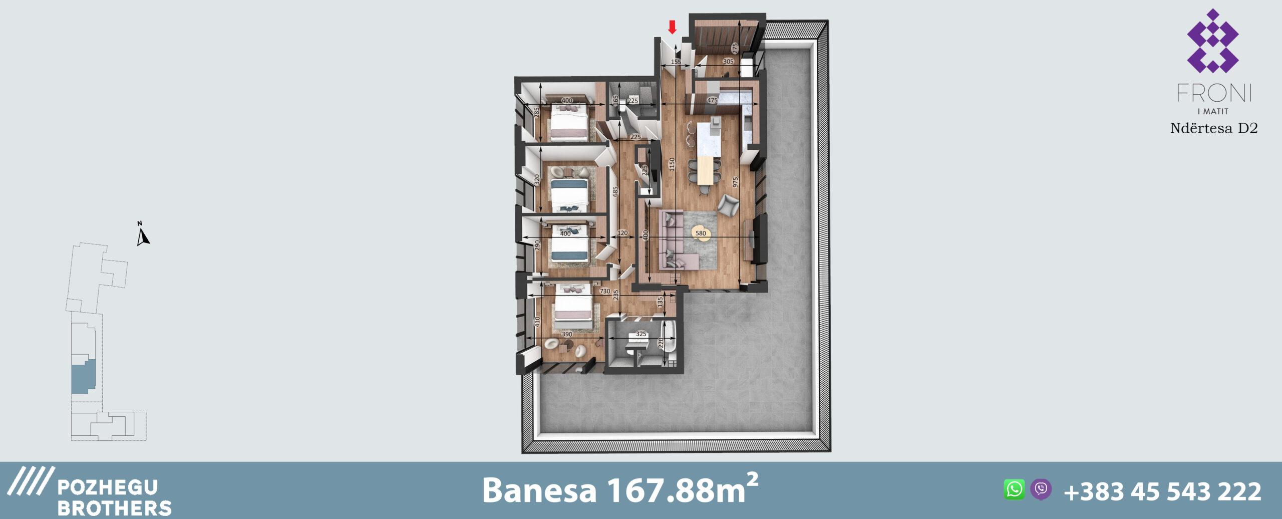 Pozicioni: Kompleks rezidencial i organizuar, per familje deri ne 5 antarë, me pamje drejt parkut të objektit, kuzhinë e bashkangjitur me dhomën e ditës dhe ballkonin dhe orientim optimal, që ofron dritë natyrale gjatë gjithë ditës.