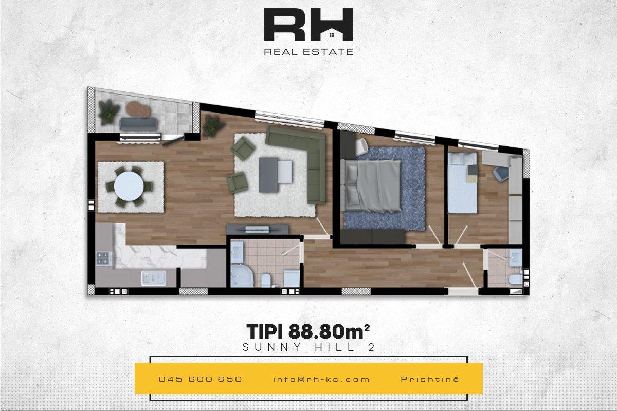 Banesat janë të sipërfaqeve të ndryshme dhe ndodhen në kompleksin ‘Sunny Hill 2’ nga Universal Bau Group. 71.98m², 88.8m², 113.52m²