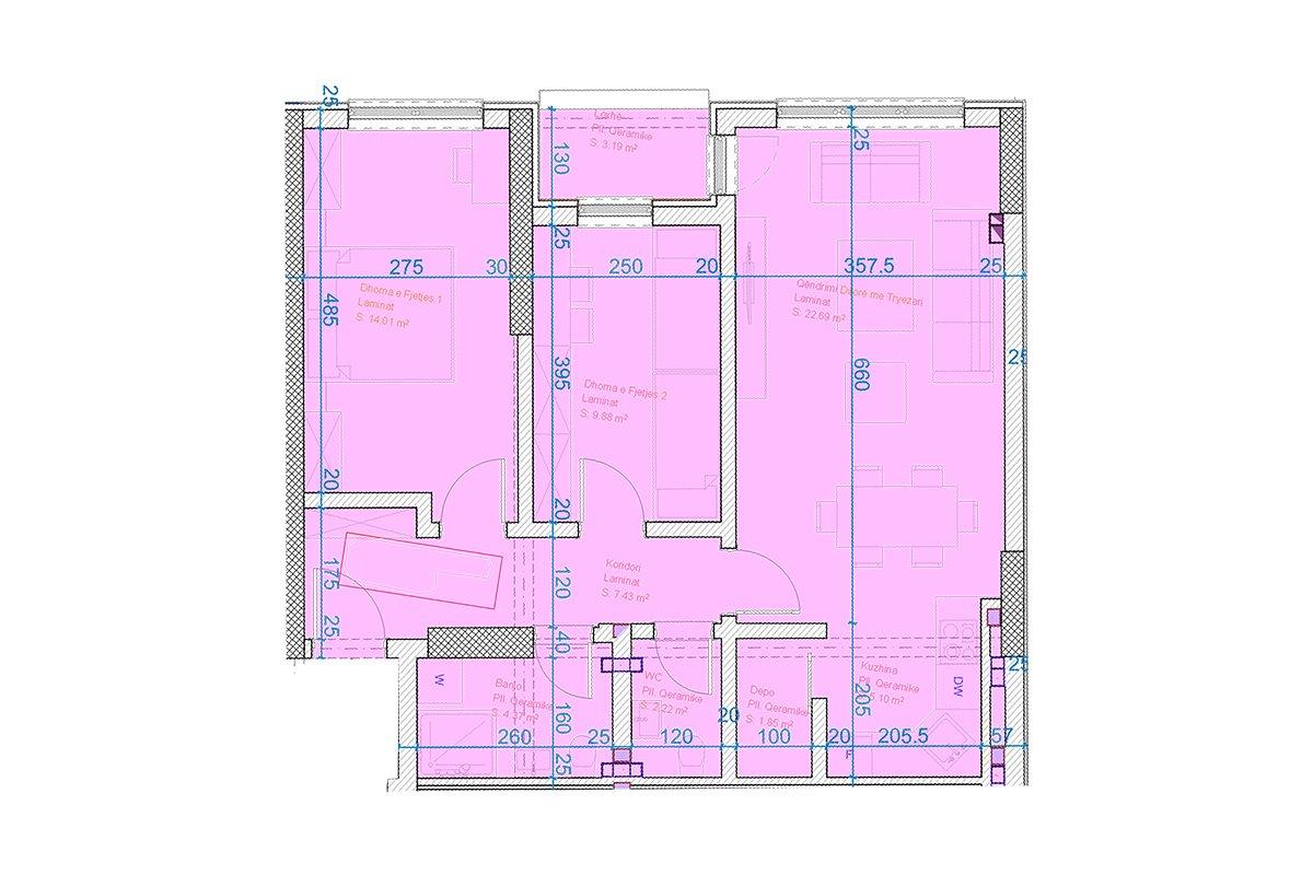 • Rënditja e banesës – Qëndrimi ditor, Kuzhinë me tryezari, 2 Dhoma gjumi, 1 Banjo, 1 Tualet, 1 Depo, 1 Ballkon.