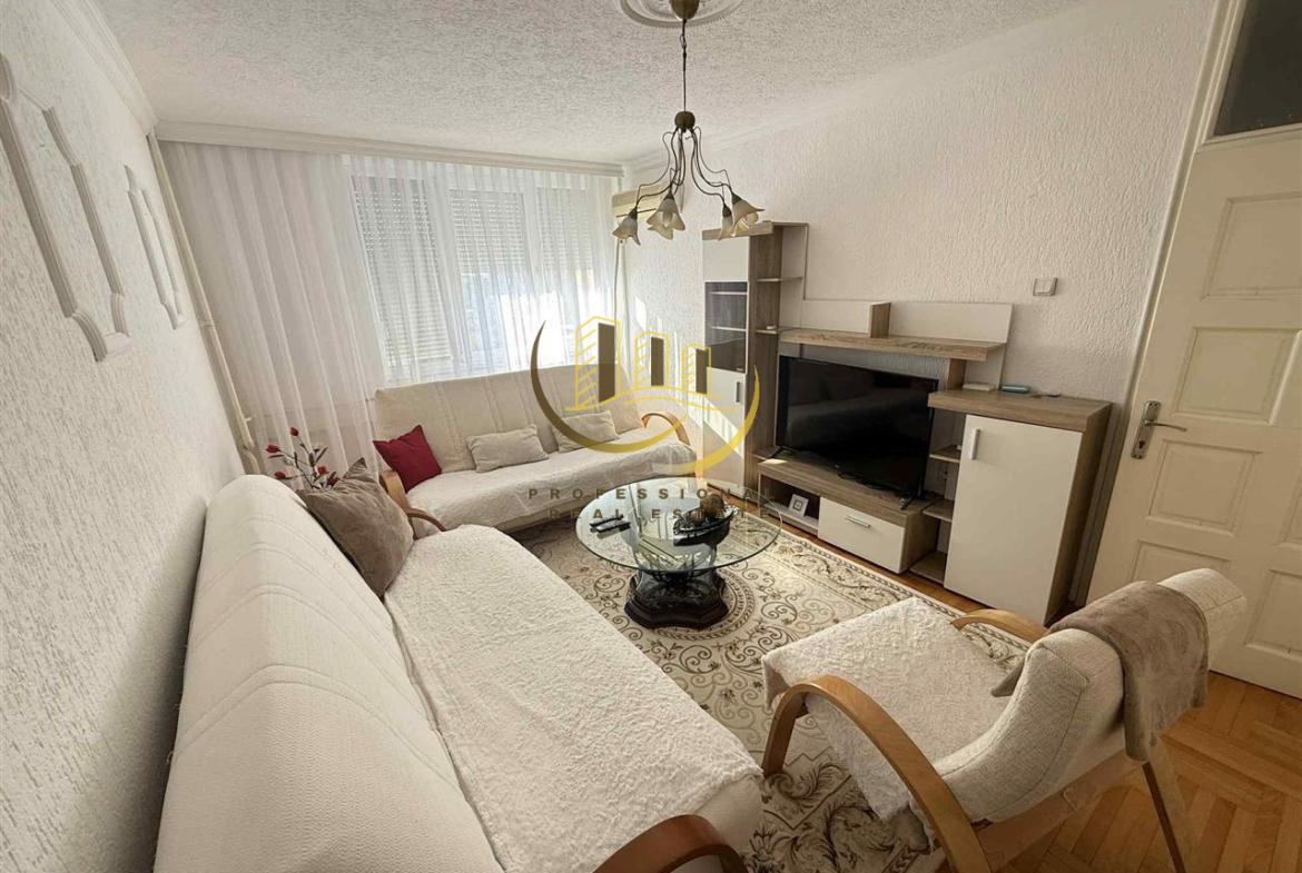 Banesë me sipërfaqe prej 70m2 në katin e 5-të me lift, ngrohje qendrore me termokos dhe kushte shumë të mira banimi, e mobiluar tërësisht.