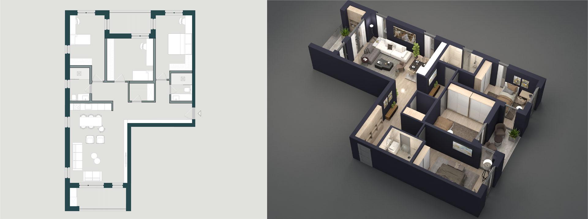 Ky organizim ofron hapësirë të bollshme, ndriçim natyral dhe komoditet maksimal për jetesë familjare.
