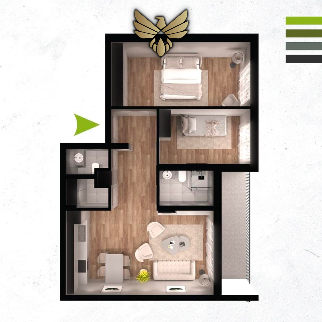 Kompleksi përbëhet nga 3 objekte me rreth 40 tipe të banesave. Disa nga karakteristikat përfshijnë fasadë të jashtme ventiluese, dritare me 3 xhama dhe roleta alumini termik, kate me dalje emergjente, dyer të blinduara, dyer dhomash me standarde europiane, 2 ashensor për çdo hyrje, sistem inteligjent të ngrohjes nën dysheme, sistem Smart Home, keramikë dhe sanitari të klasit të parë, shkallë me granit natyral, ndarje të njësive me 2 mure me izolim, koeficient ndriçimi dhe hapësira gjelbëruese sipas standardeve europiane, pamje nga qyteti, etj. Banesa ndodhet në katin e 4-të dhe është në proces të ndërtimit. Posedon dy ashensor dhe parking të mjaftueshëm.
