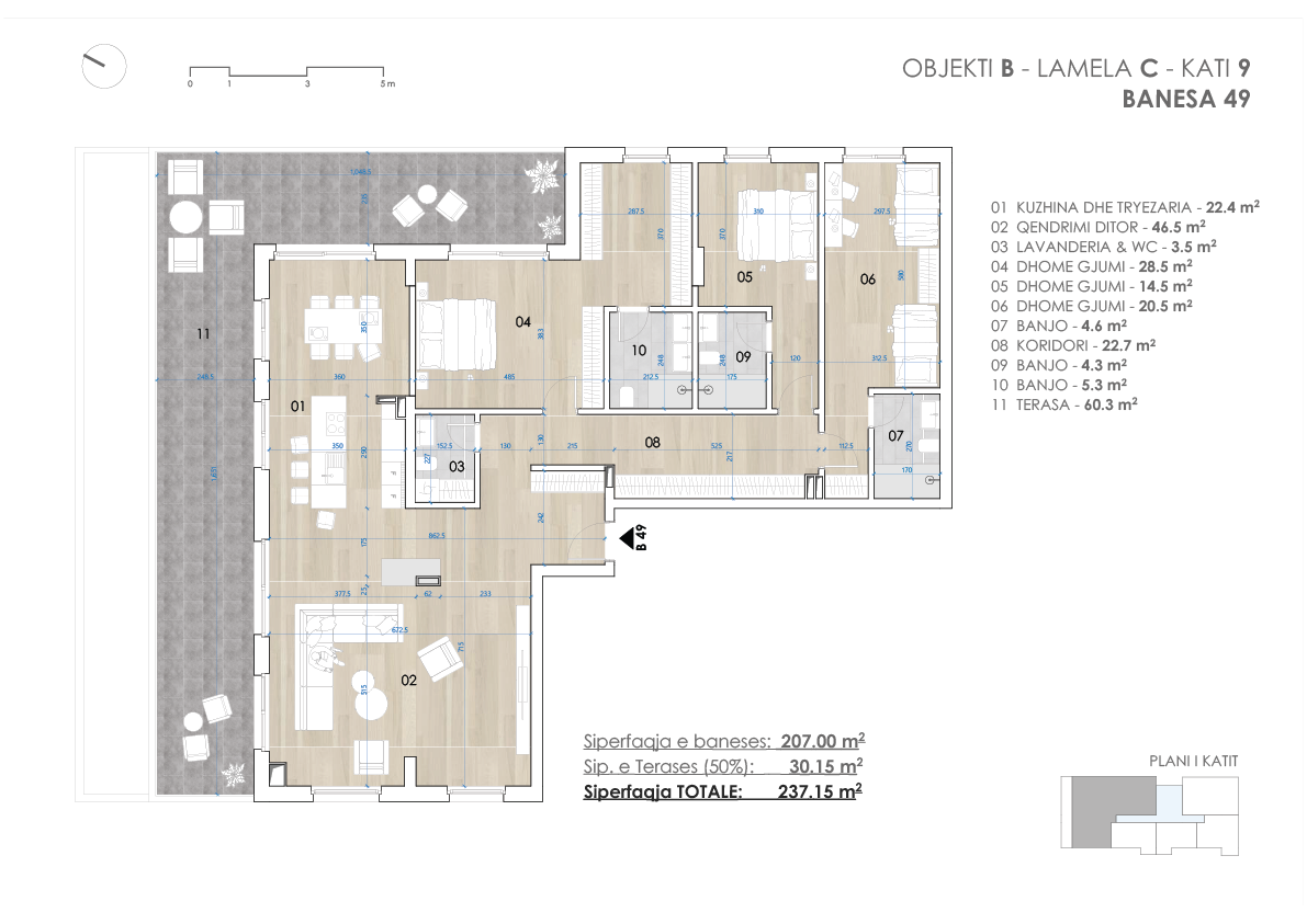 Detajet e banesës – Objekti B, Lamela C, Kati 4-7, Banesa B19, Siperfaqja totale 237.15 m2