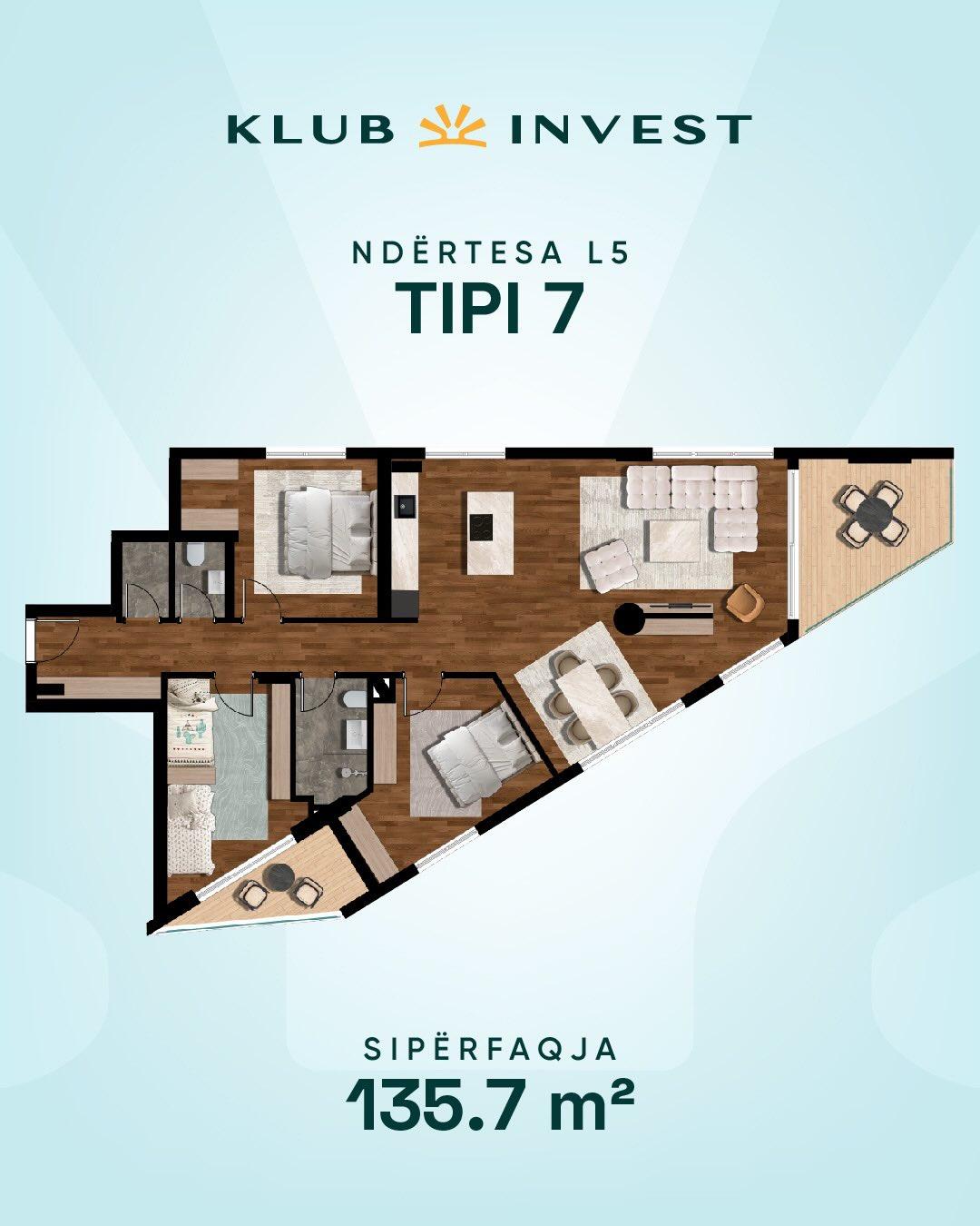 Ofrohet banesë për shitje, KLUB INVEST, ndërtesa L5, Tip 07, 135.7m2