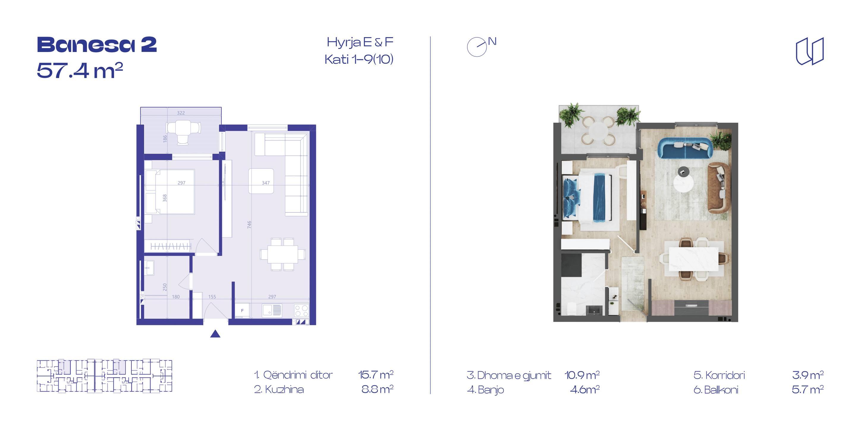 Banesa 2, Hyrja E&F, Kati 1-10, 57.4m2