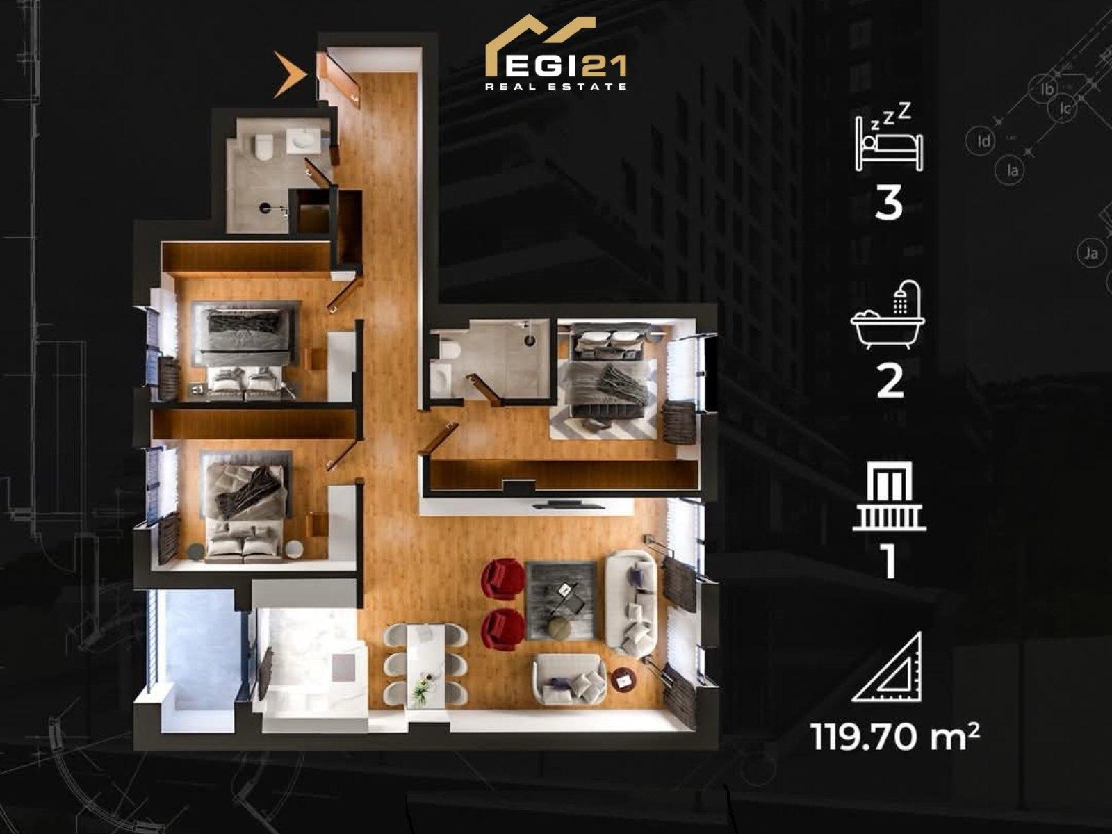 - Organizim funksional: sallon me kuzhinë, 3 dhoma gjumi, 2 banjo dhe ballkon