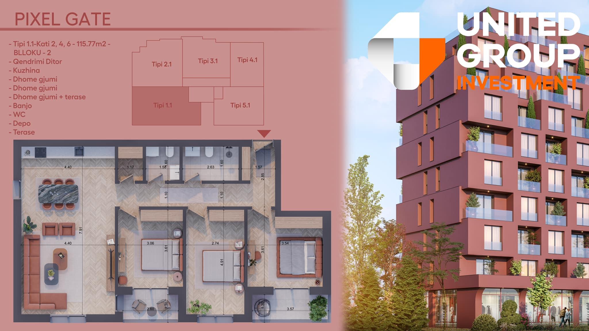 Banesë në shitje, Pixel GATE, Blloku 1.1, Tip 2, Kati 2, 4, 6 - 115.77m2