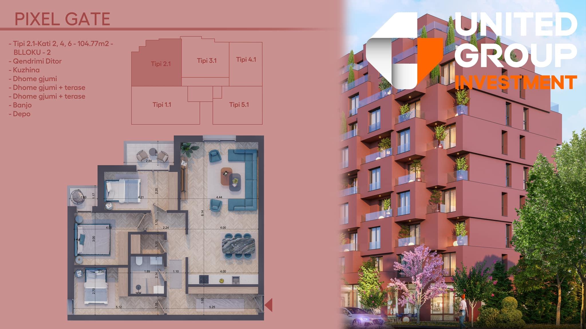 Banesë në shitje, Pixel GATE, Blloku 2, Tip 2.1, Kati 2, 4, 6 - 104.77m2