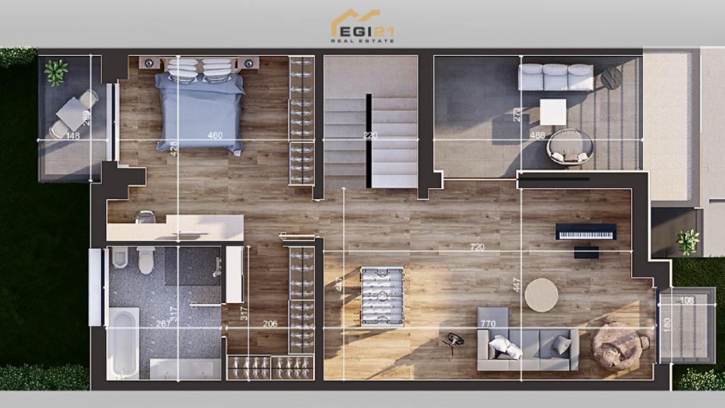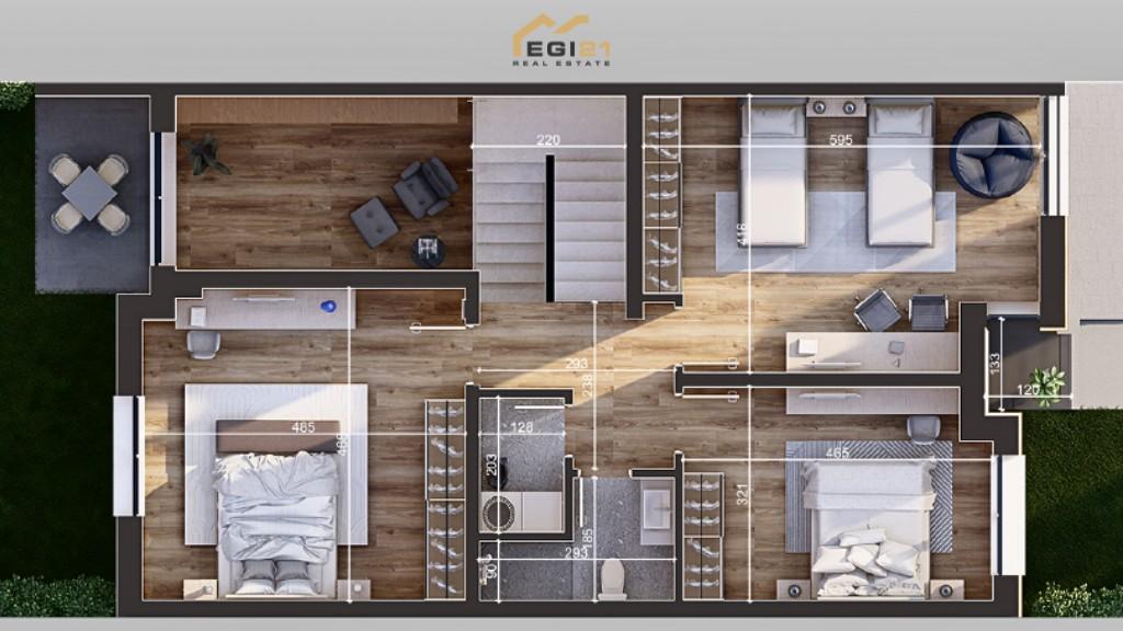- Kati i dytë: sallon me dalje në terracë të madhe, një dhomë gjumi me ballkon, një banjo