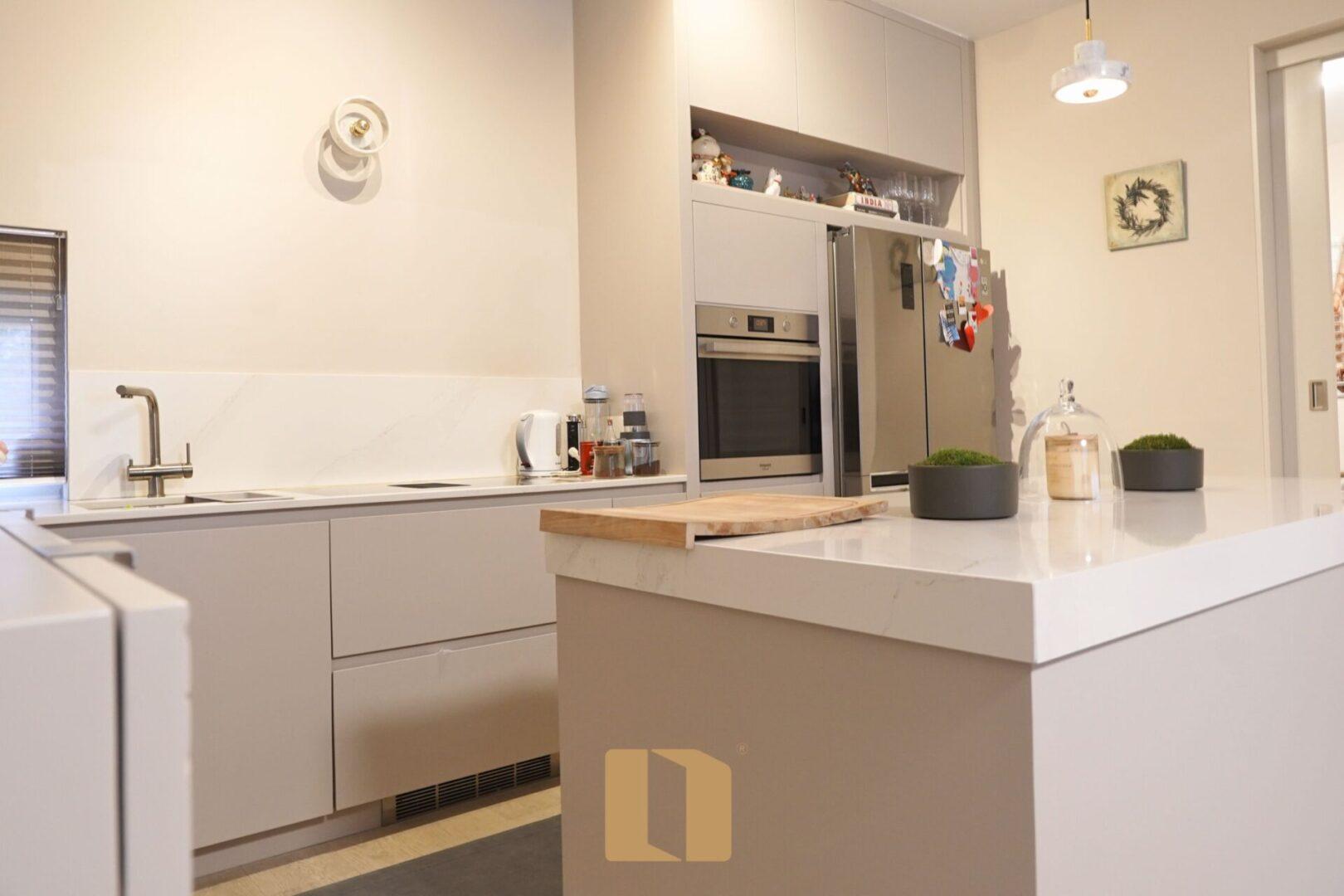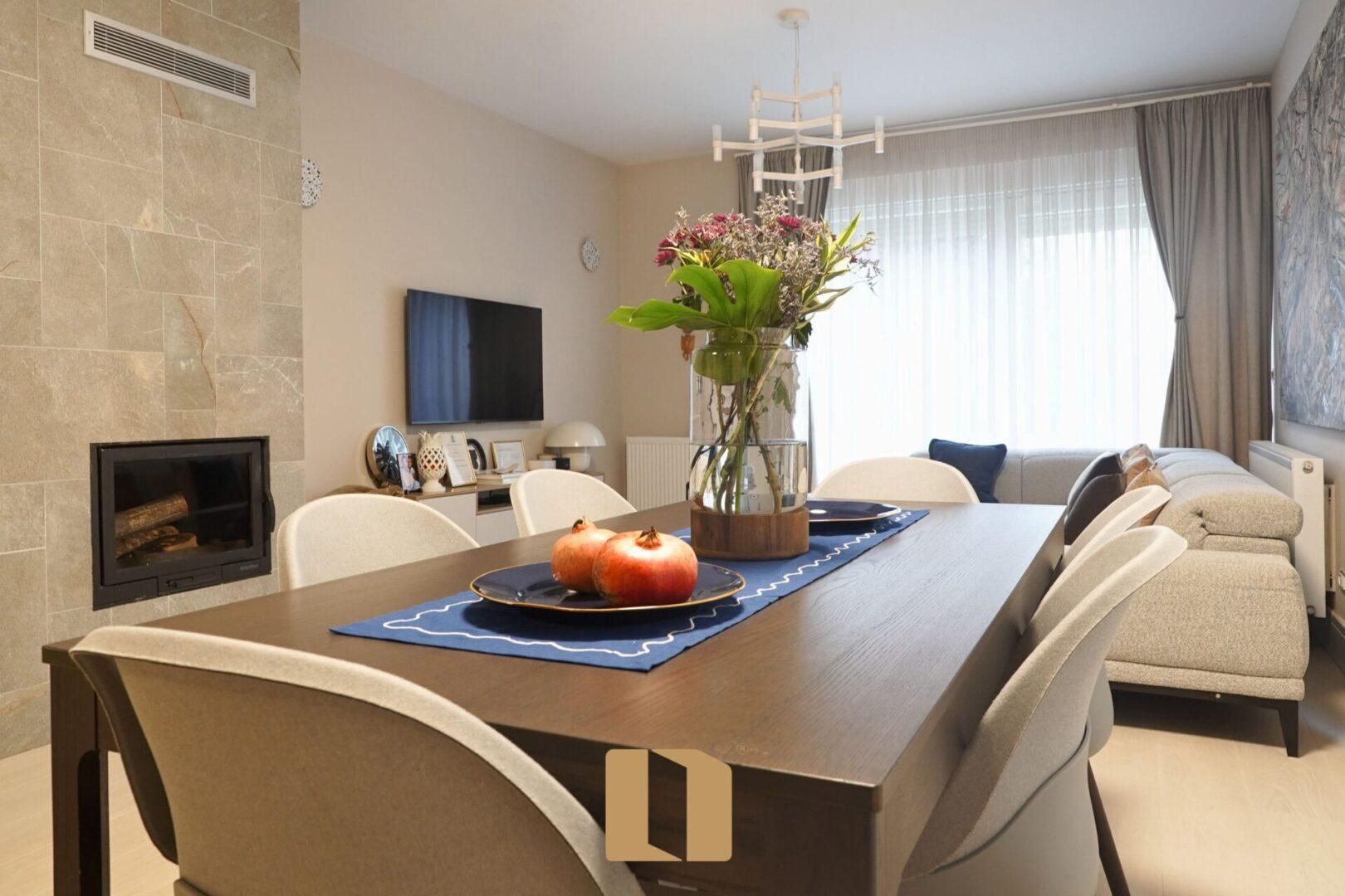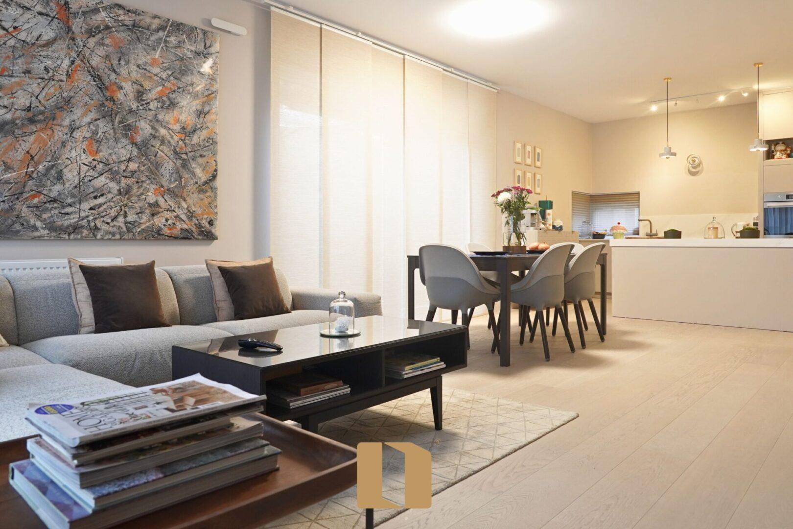 - Dhomë dite e ndriçuar e lidhur me kuzhinë moderne për gatim dhe argëtim