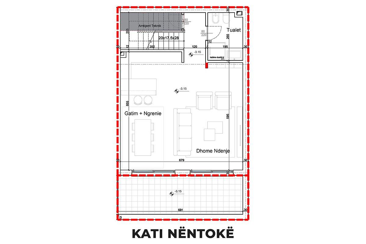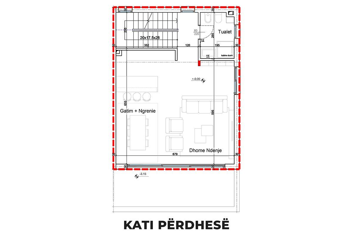 • Kati nëntokë: Qëndrimi ditor | Kuzhinë me tryezari | 1 Banjo | 1 Depo