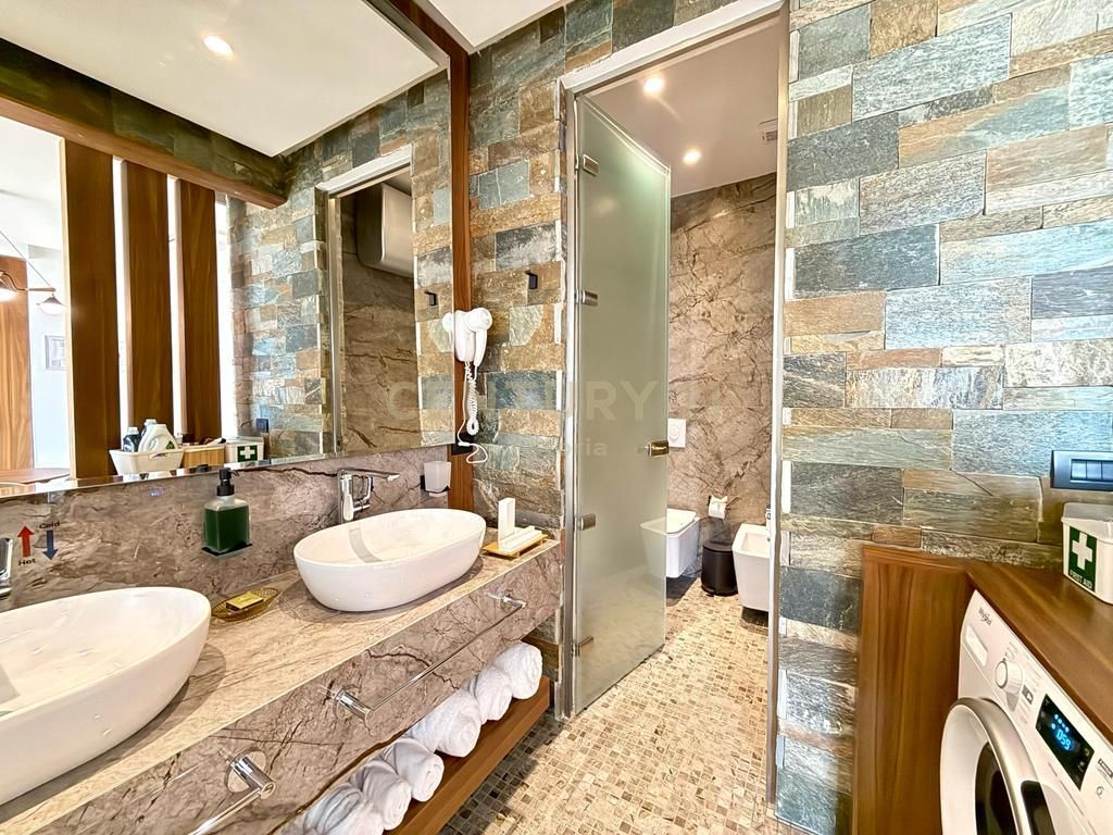 • Banjo me stil spa, veshje me gurë natyral, dush me sistem masazhi dhe lavaman modern dizajni.