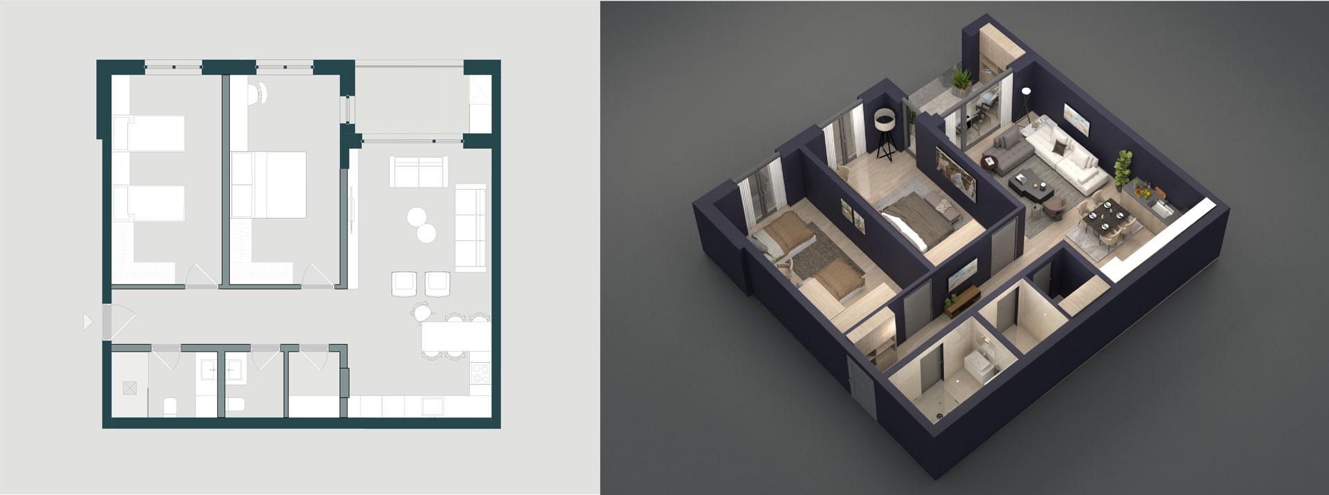 Ky organizim ofron hapësirë të bollshme, ndriçim natyral dhe komoditet maksimal për jetesë familjare.