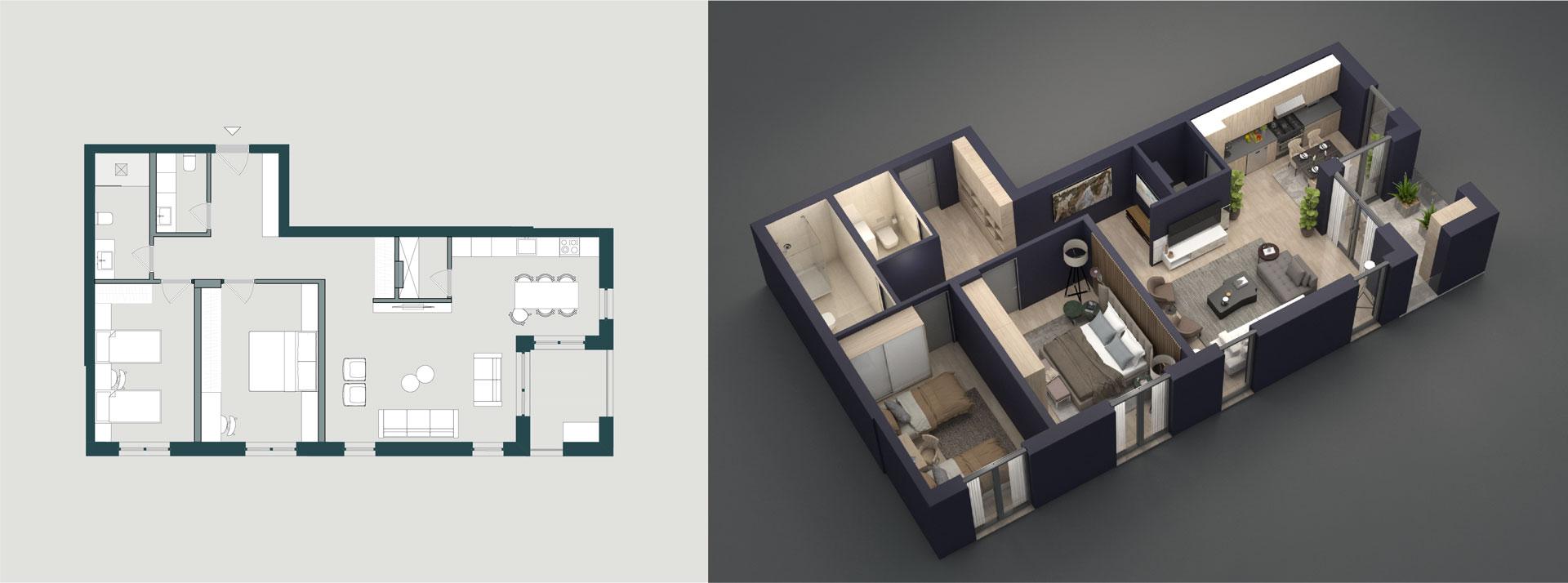 Ky organizim ofron hapësirë të bollshme, ndriçim natyral dhe komoditet maksimal për jetesë familjare.