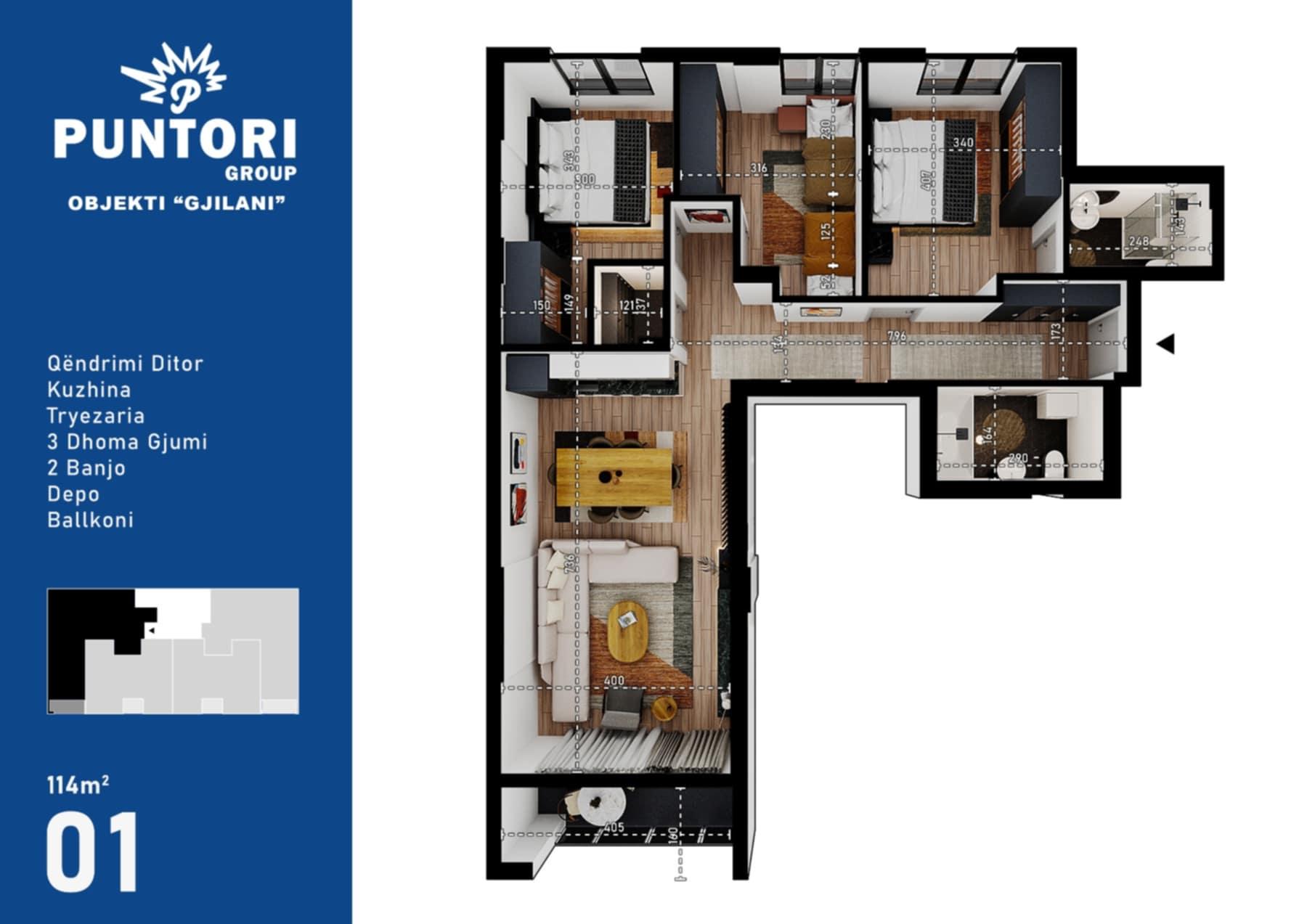 Ofrohet për #shitje banesa me sipërfaqe prej 114m² (5-të i banimit) me lokacion në kompleksin Puntori që gjendet në rrugën Lufta e Gjilanit 44, përkatësisht në lagjen Fidanishte (afër Gjykates e përball AlbiMall) në Gjilan.