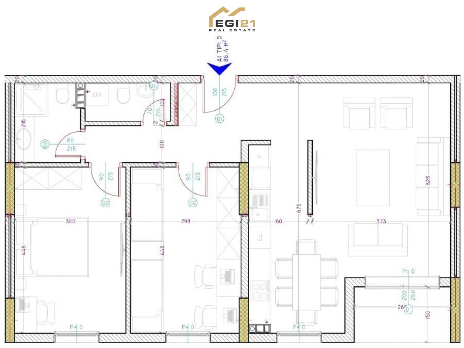 • Organizim funksional: sallon me kuzhinë, 2 dhoma gjumi, banjo, tualet dhe ballkon