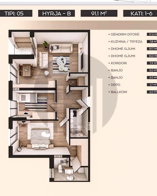 • Organizim funksional – qëndrim ditor, kuzhinë, dy dhoma gjumi të bollshme, dy banjo, depo dhe ballkon me pamje të këndshme