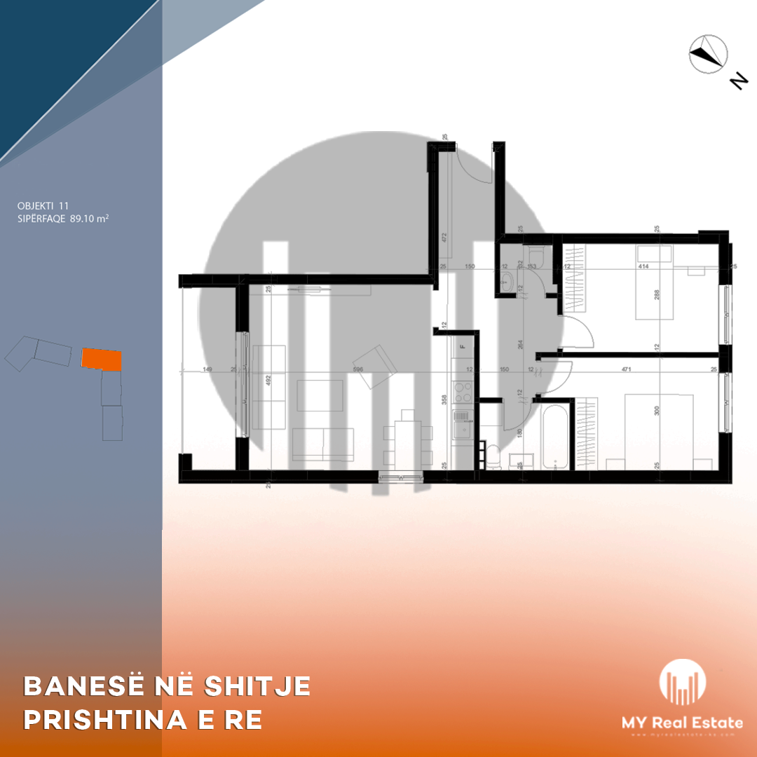 Banesa ndodhet në një zonë të privilegjuar të lagjes Prishtina e Re, në kompleksin Park Residence, e ndërtuar me standarde të larta nga Berisha Group. Sipërfaqe: 89.10m2