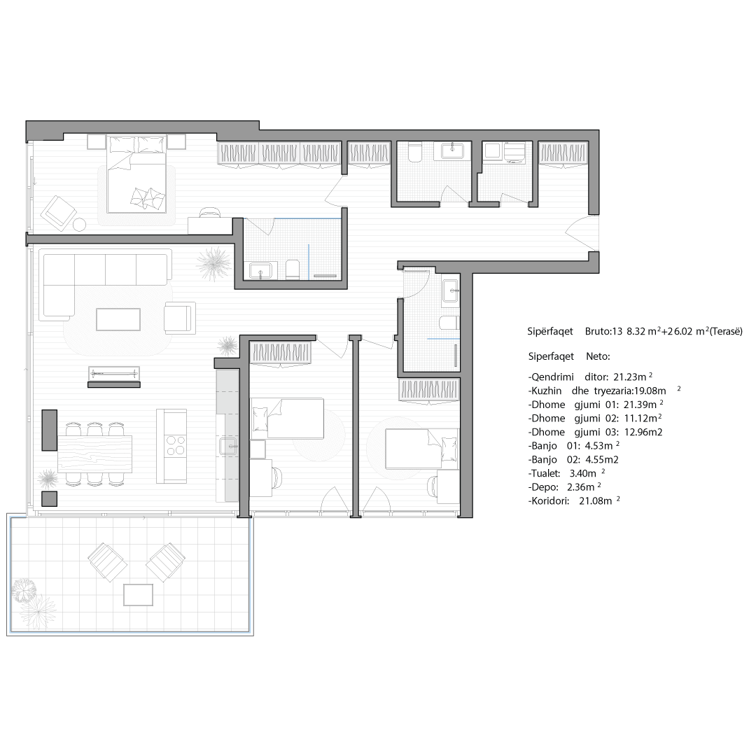 Çdo apartament është projektuar me kujdes për të ofruar rehati, funksionalitet dhe standard të lartë jetese.
