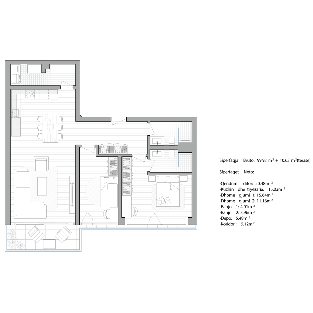 Çdo apartament është projektuar me kujdes për të ofruar rehati, funksionalitet dhe standard të lartë jetese.