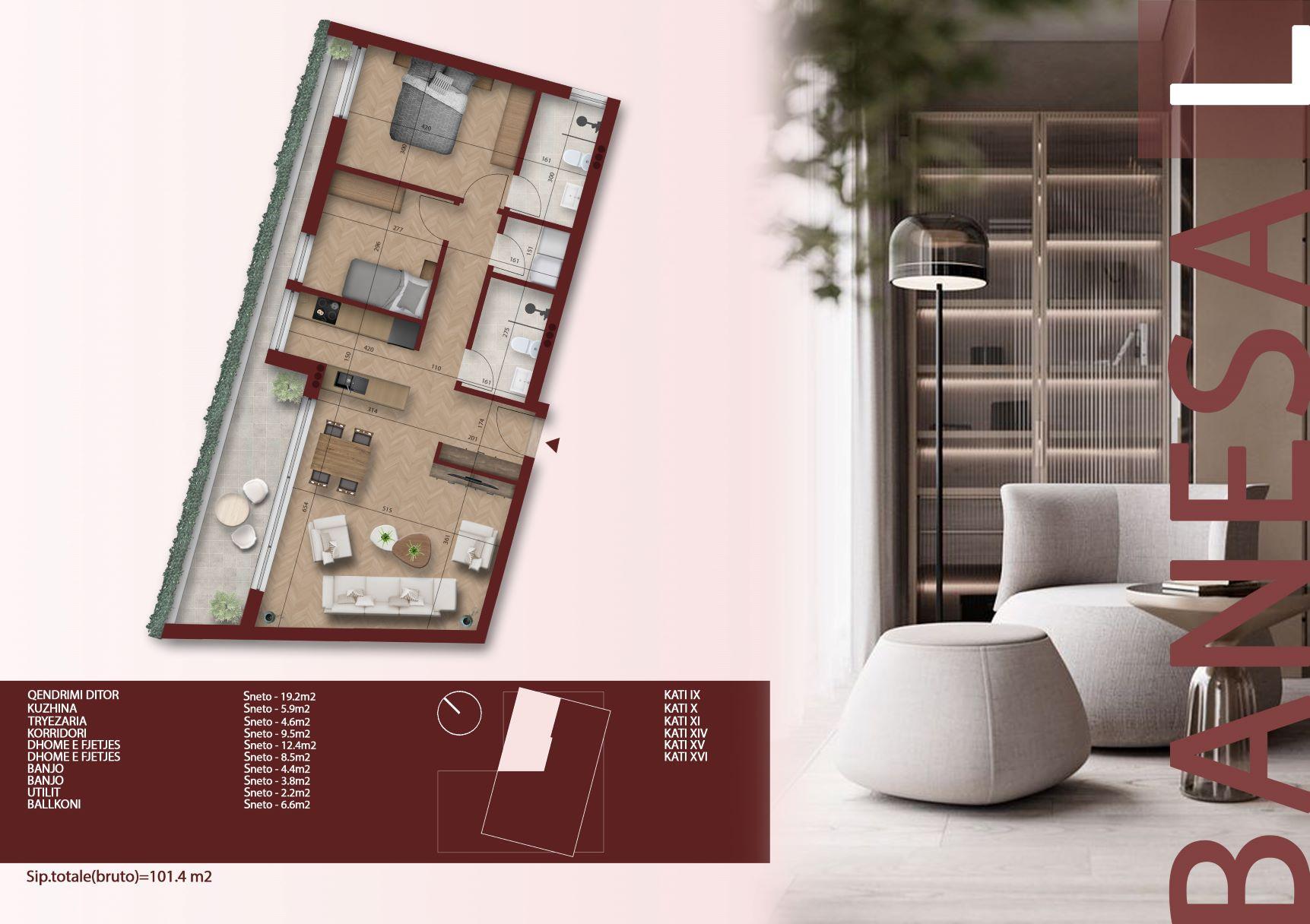 • Sipërfaqe totale bruto:  101.4 m²