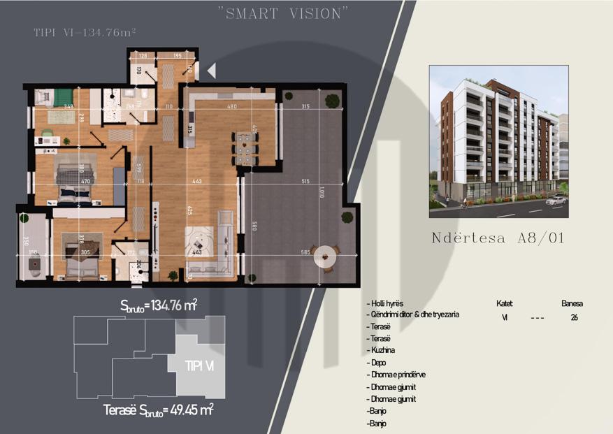 Ky penthouse modern me sipërfaqe totale prej 134.76m² ofron një terasë të bollshme prej 49.45m² dhe ndodhet në një kompleks të ndërtuar nga Smart Vision, projektuar nga CAD Partners.