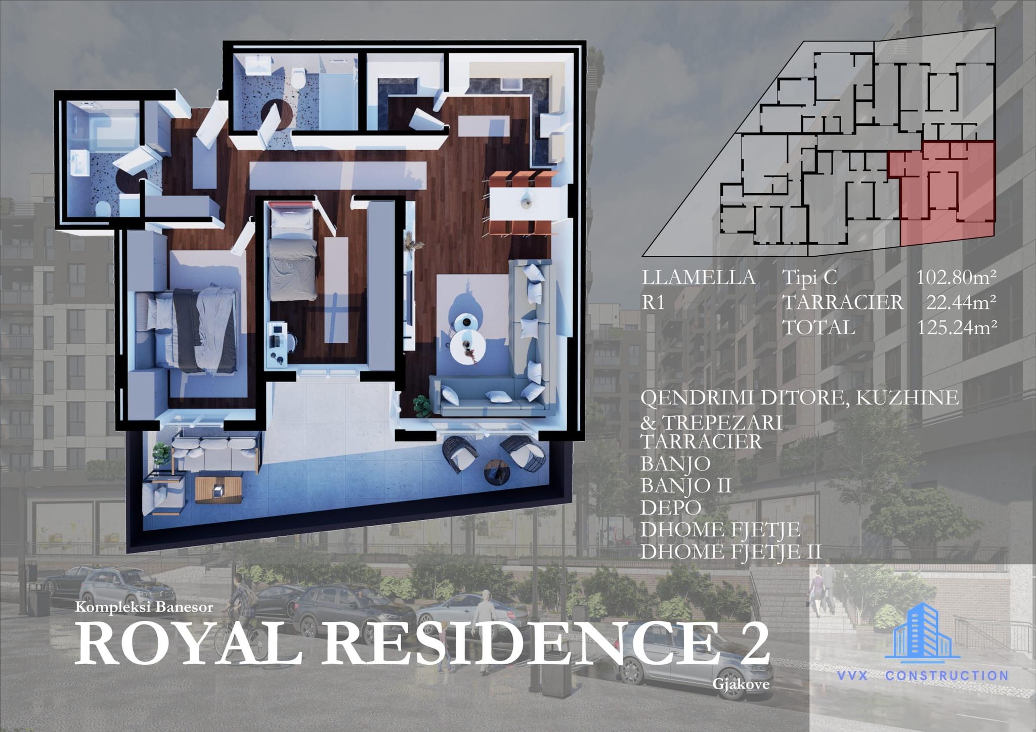 Royal Residence në Gjakovë është projektuar për ata që kërkojnë luks të përballueshëm, pa bërë kompromis në komoditet dhe cilësi. Kompleksi ofron apartamente të madhësive dhe tipeve të ndryshme (Tipi A, B, C, D, E, F), të organizuara në Llamella 1 dhe Llamella 2, përfshirë edhe njësi me tarraca (Tarracier).