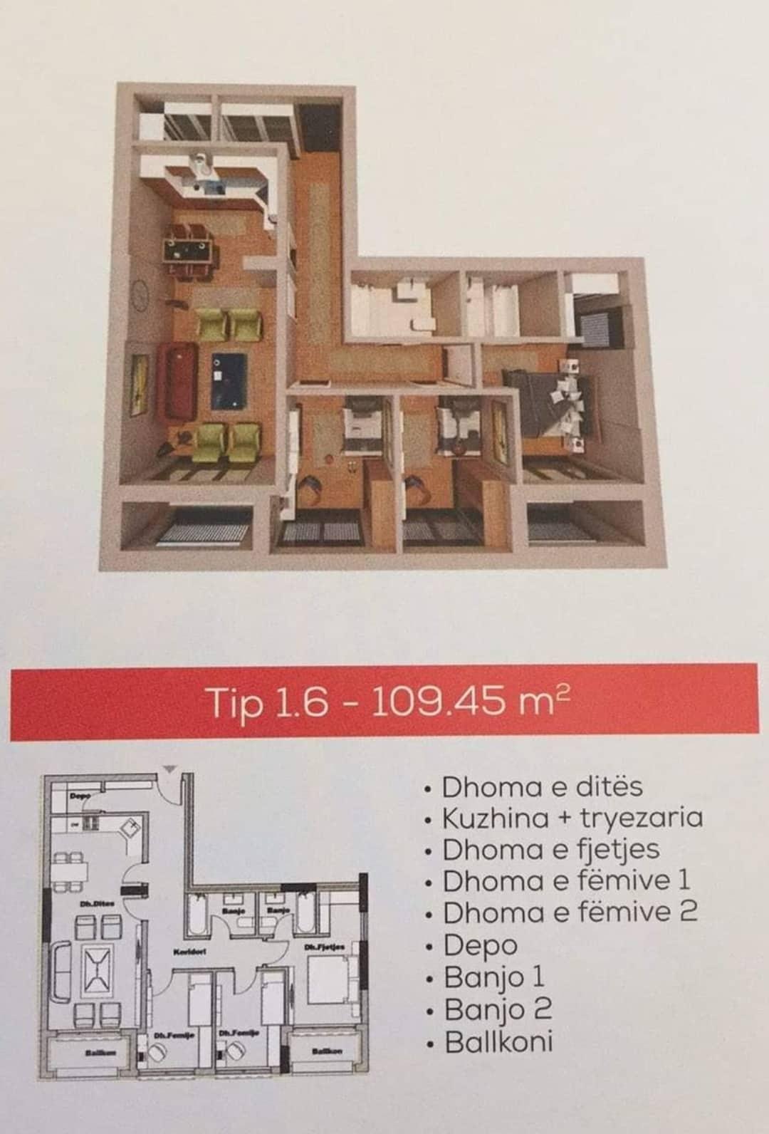 • Rënditja: Sallon me kuzhinë, 3 dhoma të gjumit, 2 banjo, 1 ballkon, 1 shpajz, 1 korridor