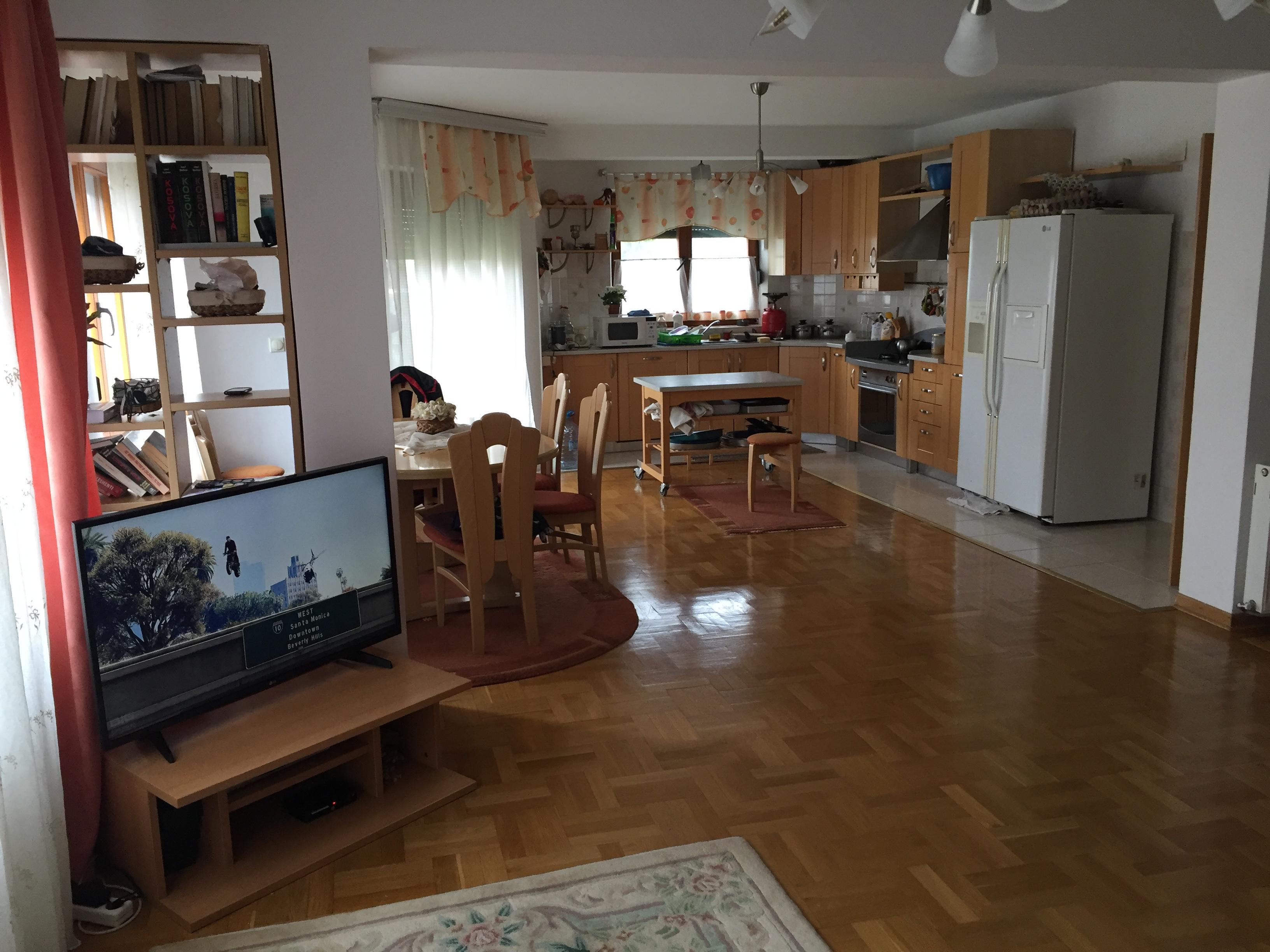 • Kati i parë: sallon me kuzhinë, dhomë gjumi, banjo, ballkon dhe korridor