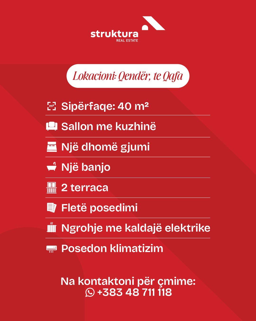 Ofrohet banesë me 40 m², e organizuar në sallon me kuzhinë, një dhomë gjumi, një banjo dhe dy terraca, duke ofruar hapësirë funksionale dhe ndriçim natyral. Organizimi praktik dhe lokacioni qendror e bëjnë këtë pronë ideale për jetesë komode ose investim të sigurt për qira.